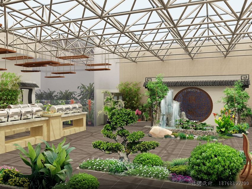 生態餐廳是綜合運用建筑學、園林學、設施園藝學、生態學等相關學科知識進行規劃、設計和建設,以設施調控技術、農藝栽培及管理技術來維護餐廳的優美環境,形成以綠色景觀植物為主,蔬、果、花、草、藥為輔的植物配置格局,結合假山、瀑布、小橋流水、竹木亭閣等園林景觀,全方位立體展現綠色、優美、宜人的就餐環境。